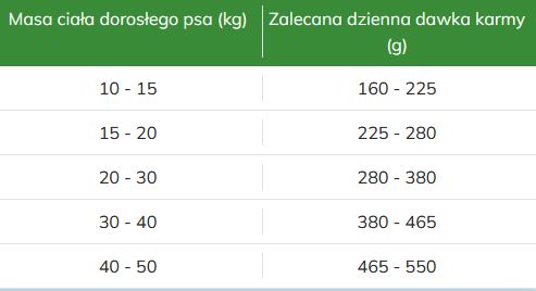 Dzienną porcję należy podzielić na 2-3 posiłki. Dostosuj dzienną ilość karmy do poziomu aktywności, kondycji fizycznej i indywidualnych potrzeb Twojego psa. Zalecane dzienne dawki karmy mogą ulec zmianie w zależności od indywidualnego zapotrzebowania psa. Ilość karmy należy zwiększyć o 10-15% w okresie zwiększonego wysiłku psa lub gdy zimą przebywa na zewnątrz.